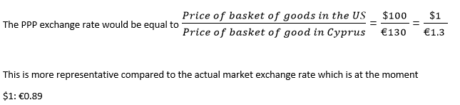 Let’s say a basket of the same goods and services is worth $100 in the US and the same basket of goods is worth €130 in Cyprus.